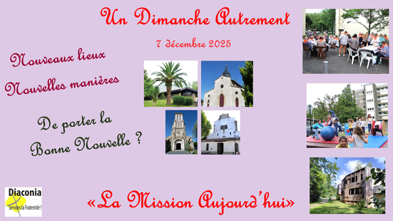 Ce dimanche 7 décembre, nous prépare a vivre la venue du "Sauveur," Autrement. Le ton est donné : "La Mission aujourd'hui" "Quels sont les nouveaux lieux ou les nouvelles manières de porter la Bonne Nouvelle, d'annoncer l'Evangile aujourd'hui" ? Très vite, nous comprenons combien la tache est énorme. On ne sait où tourner la tête, à droite, à gauche ? "Oui," les associations d'aides sont nombreuses et attendent les bénévoles... Des quartiers nouveaux surgissent, la pauvreté...